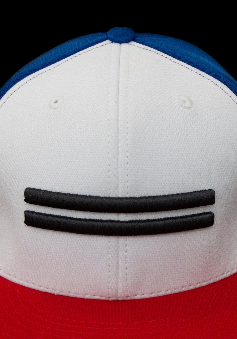 Official Team Warstic National Game Cap features red brim, white front with black embroidered Warstripes and blue rest of cap. Stretch fit, six-panel design; polyester/spandex blend. Available in four sizes.