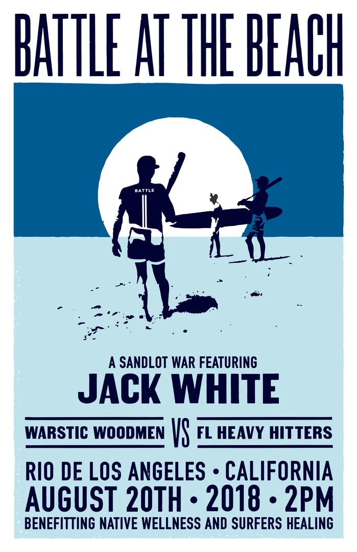 This special edition screen print commemorates the 2018 Battle at the Beach California Sandlot between The Warstic Woodmen and Farm League Heavy Hitters. It was sold exclusively at Jack White’s Santa Barbara Concert and at the Los Angeles sandlot game. Poster is 13″x19″ and features three tone blue screen printing.