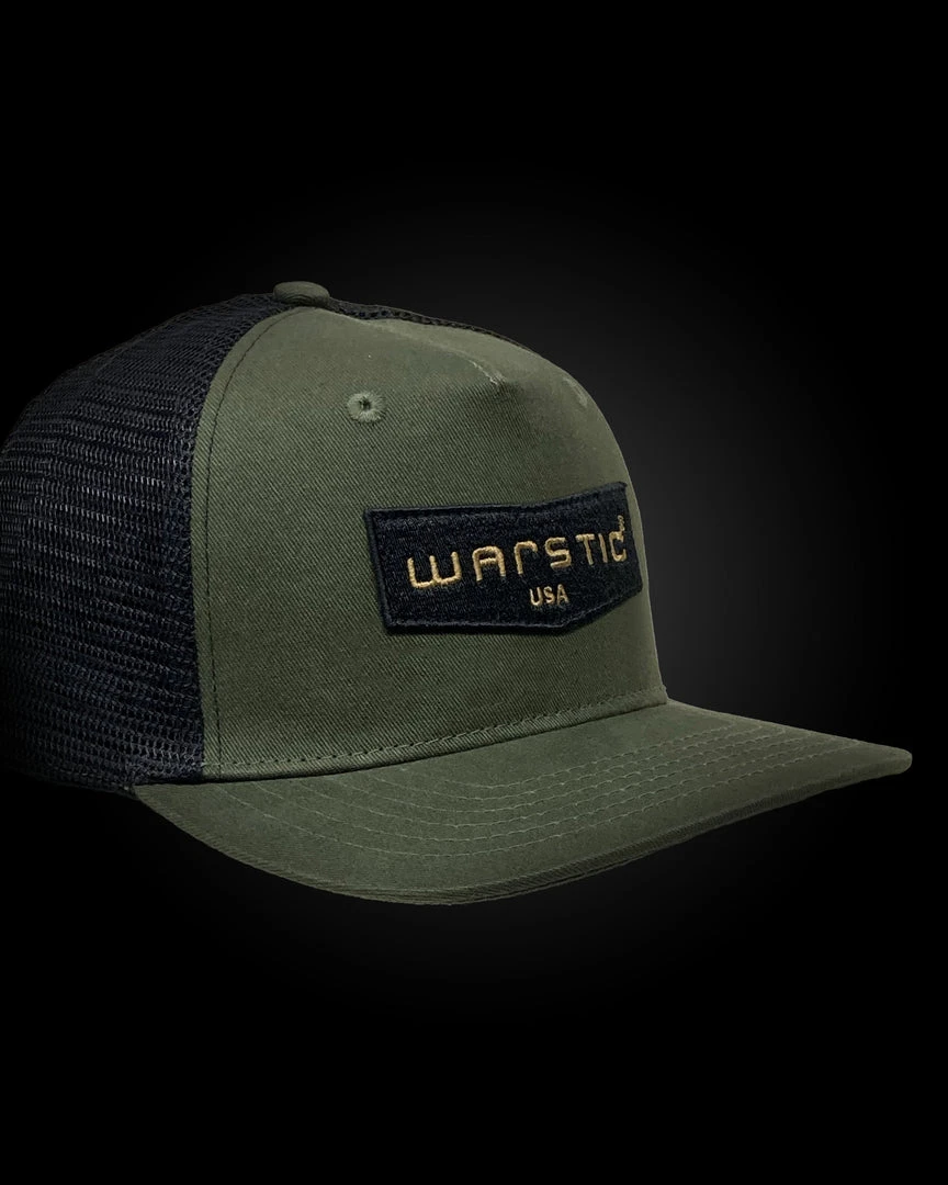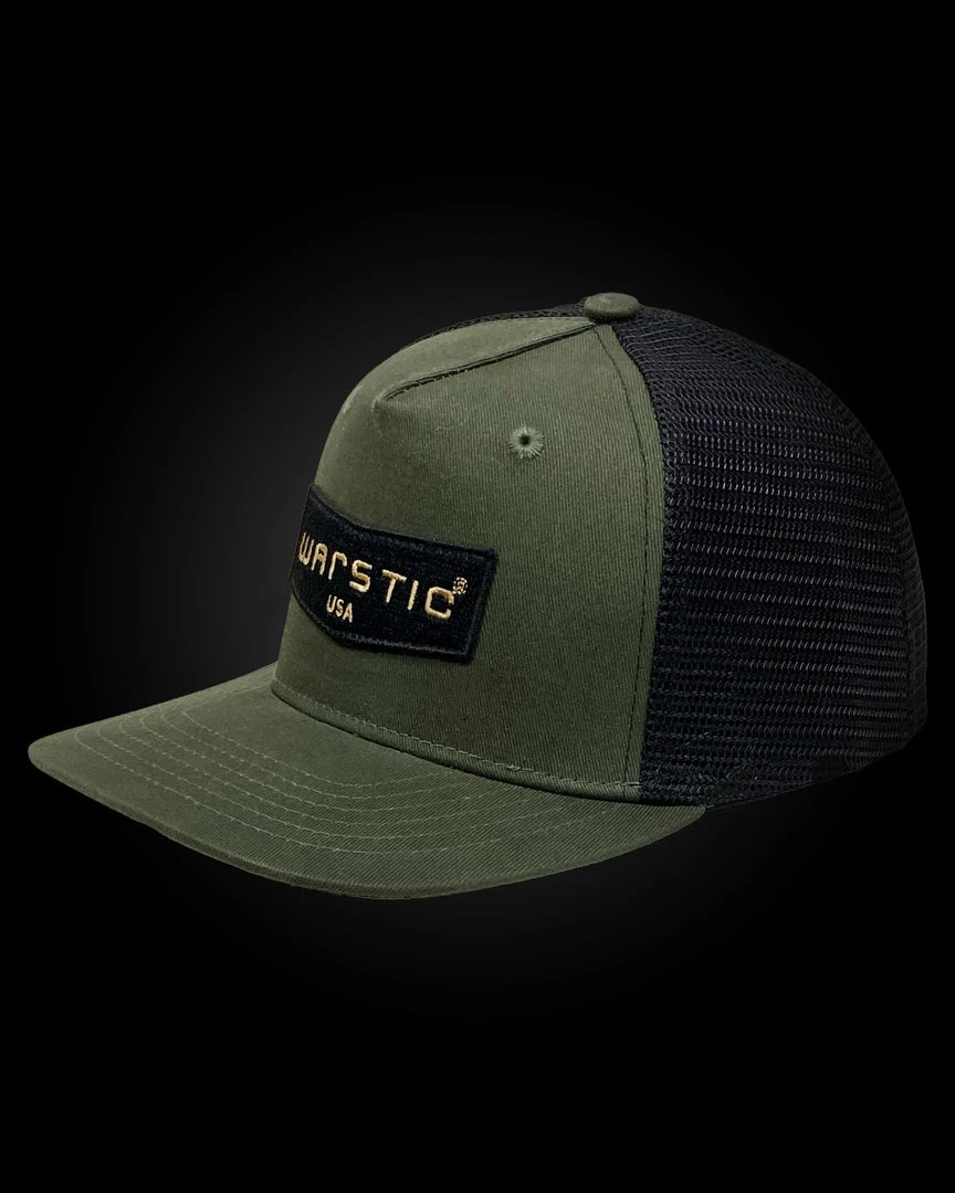 The Warstic Trucker Snapback Army Green/Black (Chevron) features our Chevron logo as a black patch with “Warstic” written in gold. Five panel design; mesh back with polyester front. Snapback. One size fits most.