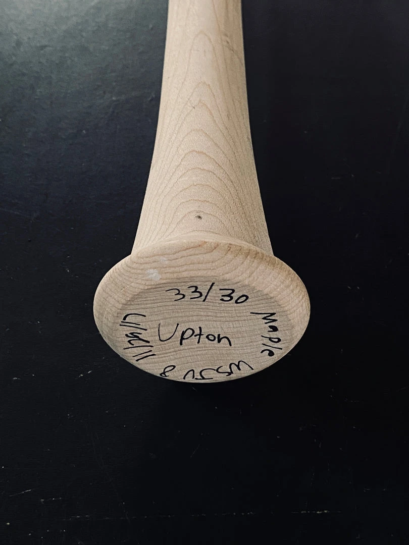 Bats created for Justin Upton for the Warstic Short Film “The Art of Hitting”. Pro Reserve Maple 33/30 WSJU8. Natural Bat with glossed handle and green Wartip. Features black Warstic logo and white engraving. Autographed.