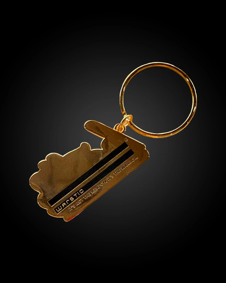 Metal keychain, plated in genuine gold. 2″ wide.