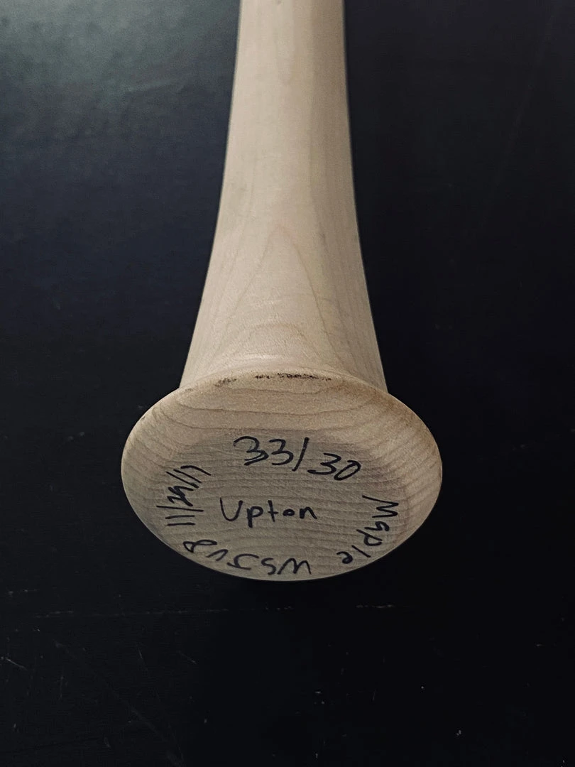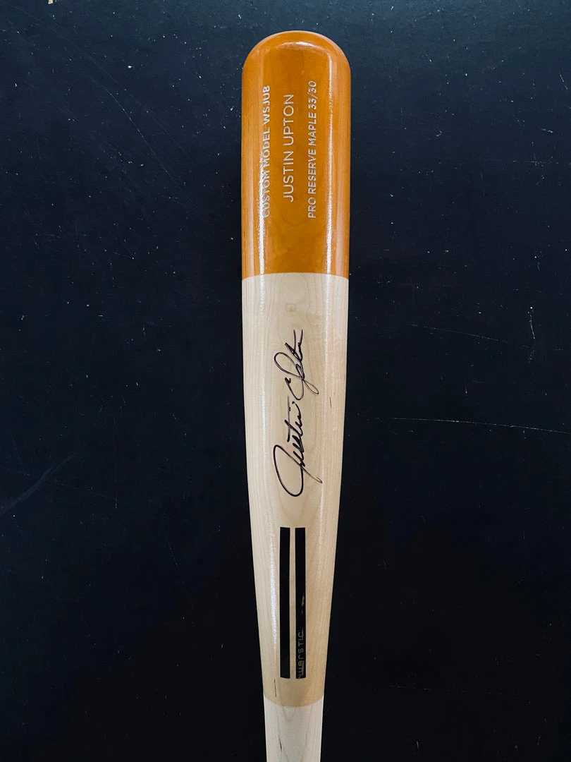 Bats created for Justin Upton for the Warstic Short Film “The Art of Hitting”. Pro Reserve Maple 33/30 WSJU8. Natural Bat with glossed handle and tan Wartip. Features black Warstic logo and white engraving. Autographed.