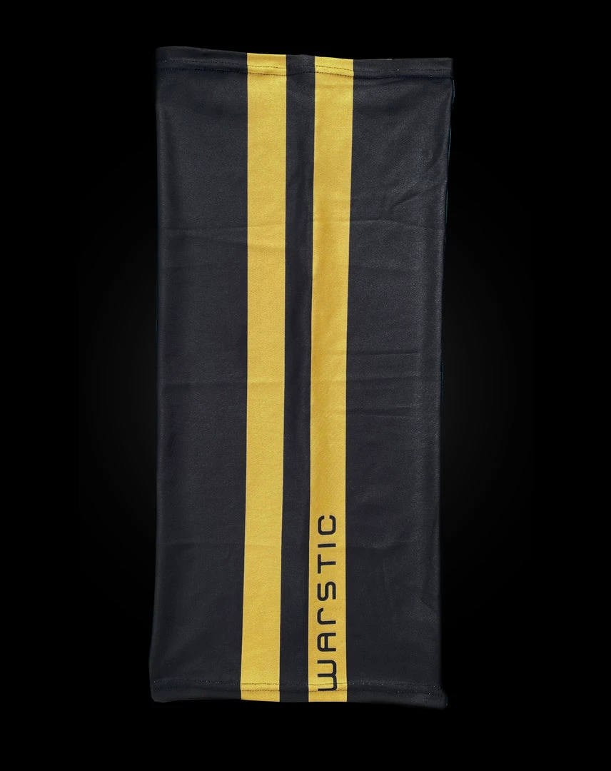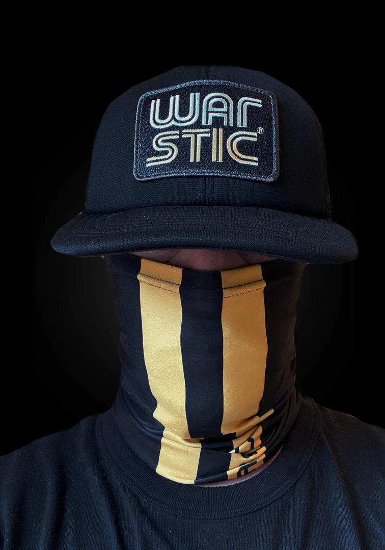 The Warstripe Neck Gaiter provides convenient face coverage with a light-weight, moisture wicking fabric. Black with gold Warstripe log on front and back, with “Warstic in black inside the Warstripes on the front and on back/seam side, “BATTLE” in white next to Warstripes near edge. One size only, will fit most adults.