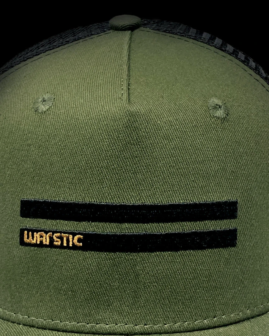 The Warstic Off-Season Snapback Army Green/Black (Warstripe) features our Warstripe logo embroidered in gold across the front of the hat. Six panel design; mesh back with polyester front. Snapback. One size fits most.