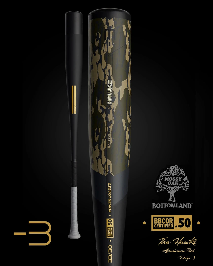 - The front of the Hawk2 is all business with a clean, black bat and only our Warstripes as a focusing mark. The back features Mossy Oak’s signature Bottomland pattern, blending with the updated 2021 arrow graphic.