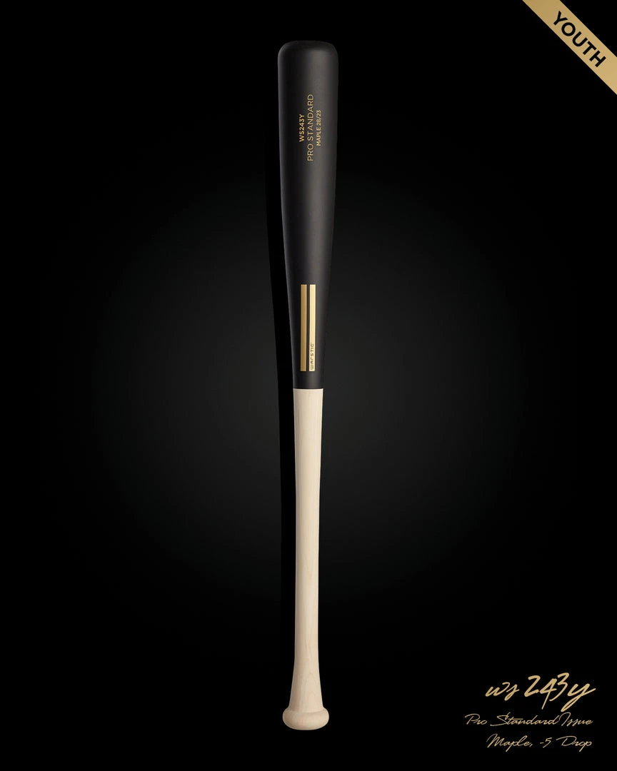 The Pro Standard Issue WS243Y Maple Youth Wood Bat has a large barrel and balanced feel; approximately -5 drop weight. The WS243Y Maple Youth has a matte black half dip barrel with a raw handle, and gold engraving. Cut from our top 10% reserve stock of maple. No custom engraving or customization available on this model.