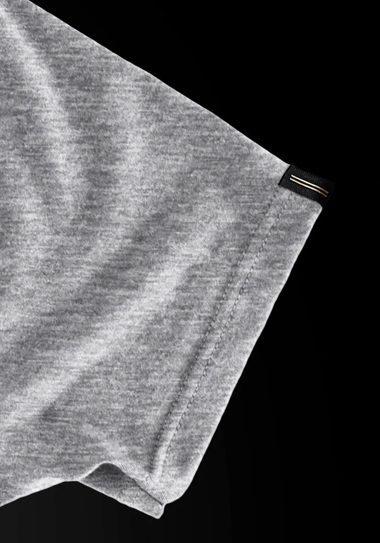 - Gray shirt with blue, red, black and white screening; athletic fit.