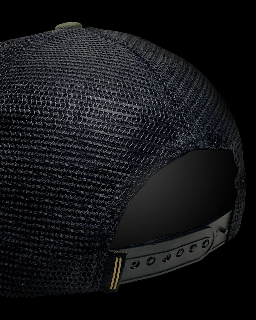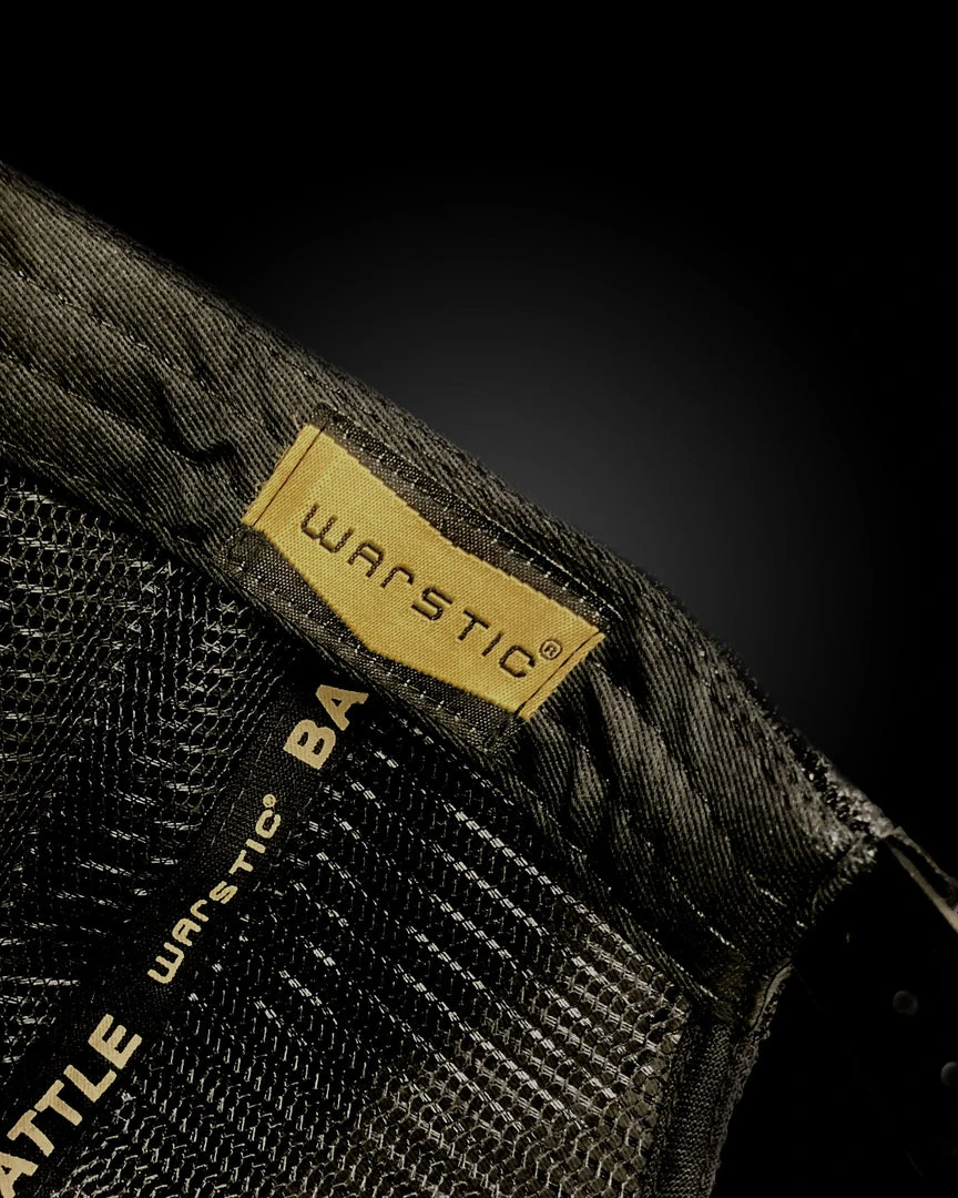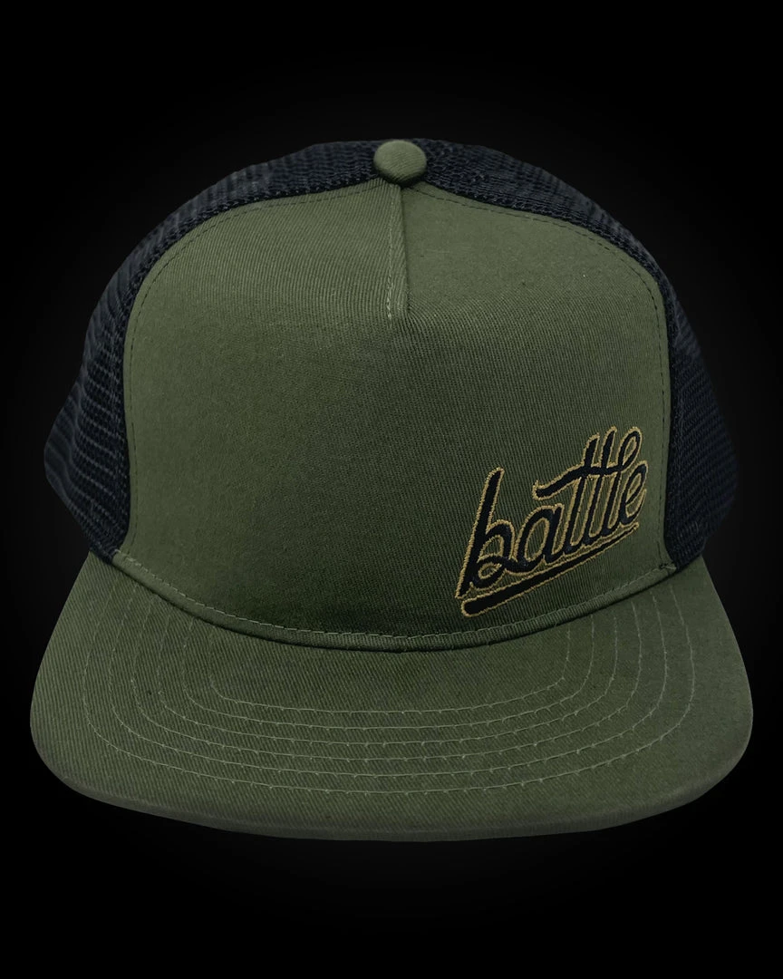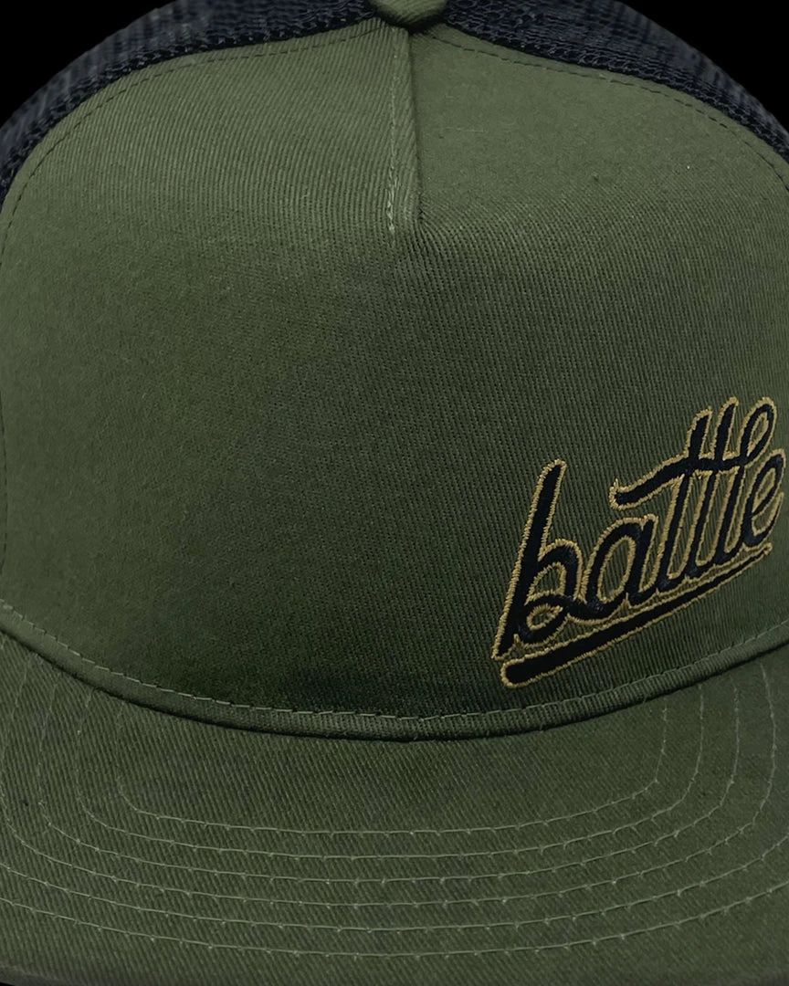 The Warstic Trucker Snapback Army Green/Black (Battle) features our Battle logo embroidered in black and gold on the front-left of the hat. Five panel design; mesh back with polyester front. Snapback. One size fits most.