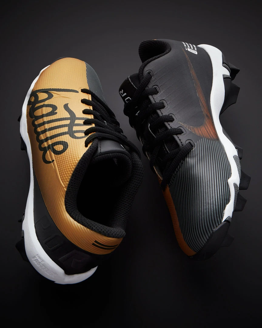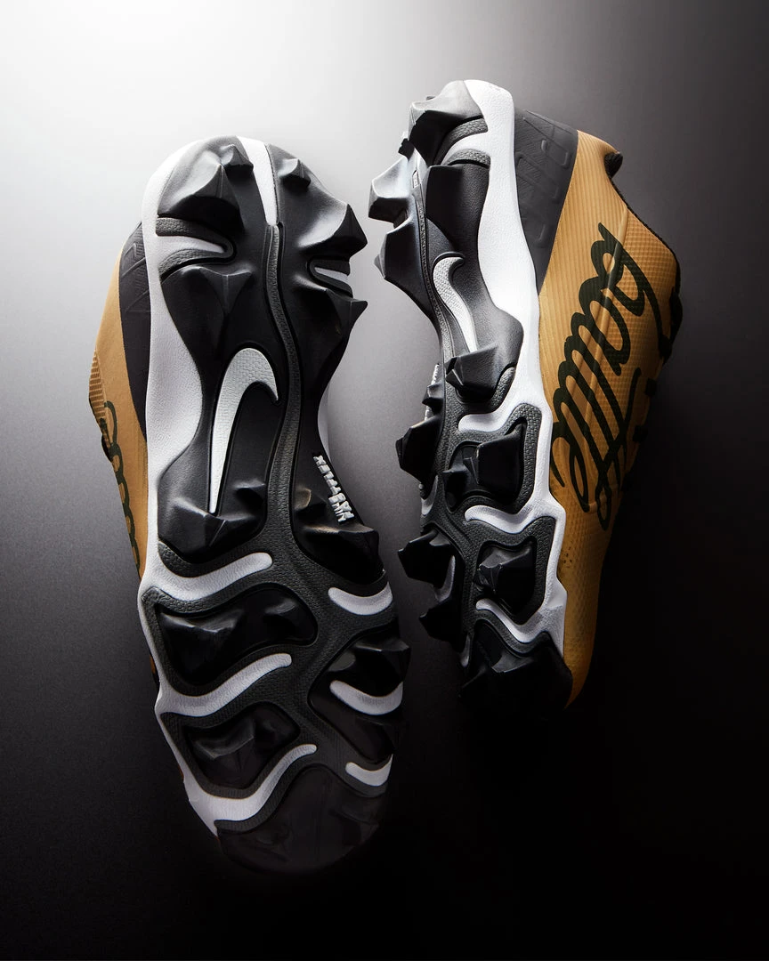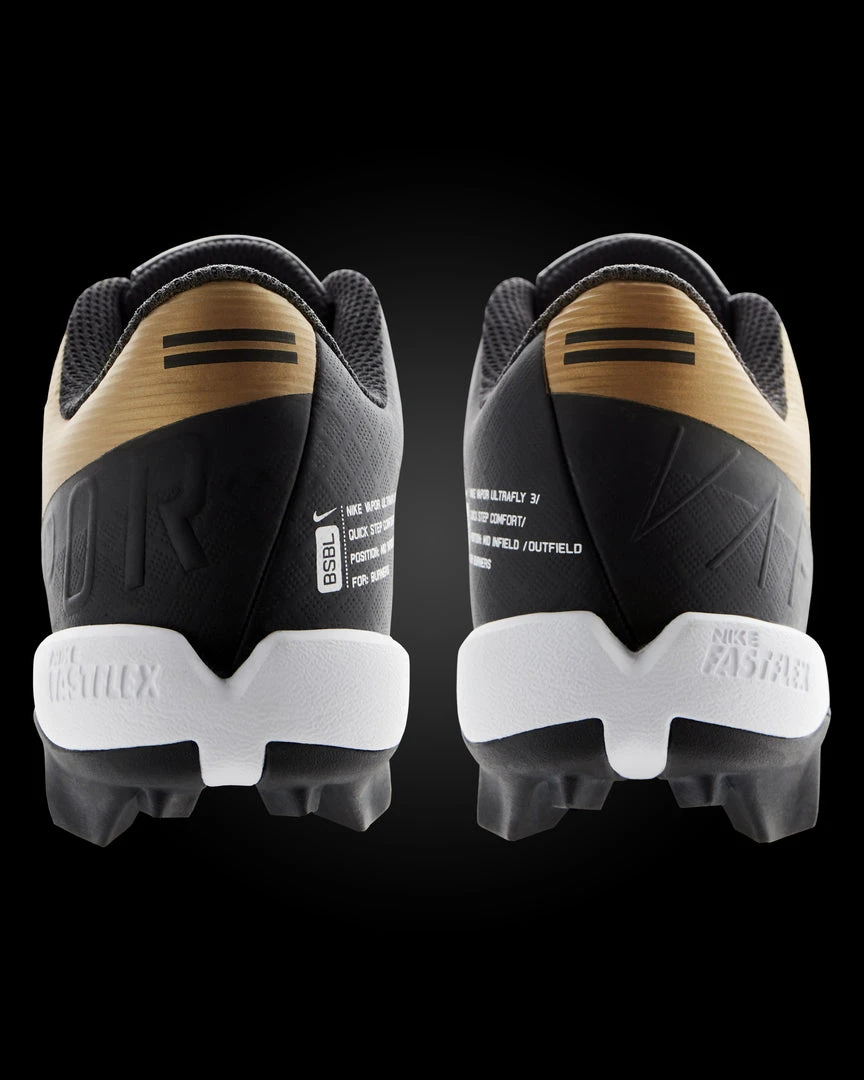 On the outer sides of the cleat, our “Battle” logo in black on a gold background, to remind you to get up, keep going, keep fighting. On the inner sides, the Nike Swoosh has been made to look as though it’s been carved out of a wood bat. On the heels, our Warstripes are added in black against a metallic gold contrast that runs back from the “Battle” art. The white cushioned foot bed meets a black molded plate for a contrasting and sleek look.